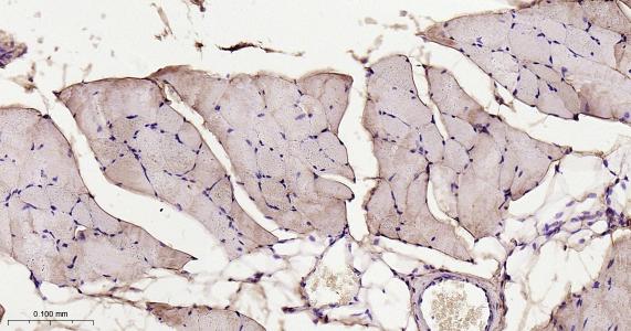 Paraformaldehyde-fixed, paraffin embedded Mouse Skeletal muscle; Antigen retrieval by boiling in sodium citrate buffer (pH6.0) for 15 min; Antibody incubation with ITGA7 Polyclonal Antibody, Unconjugated (bs-1816R) at 1:200 overnight at 4°C, followed by conjugation to the bs-0295G-HRP and DAB (C-0010) staining.