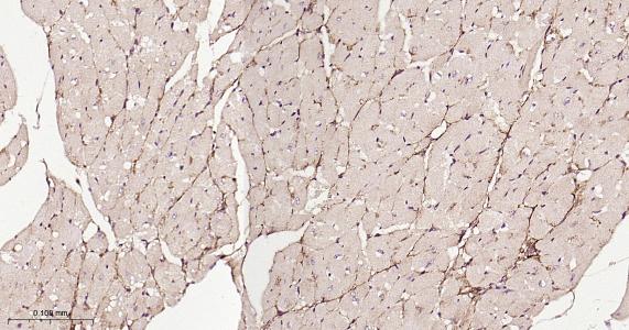 Paraformaldehyde-fixed, paraffin embedded Mouse Heart; Antigen retrieval by boiling in sodium citrate buffer (pH6.0) for 15 min; Antibody incubation with ITGA7 Polyclonal Antibody, Unconjugated (bs-1816R) at 1:200 overnight at 4°C, followed by conjugation to the bs-0295G-HRP and DAB (C-0010) staining.