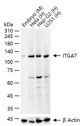 25 ug total protein per lane of various lysates (see on figure) probed with ITGA7 polyclonal antibody, unconjugated (bs-1816R) at 1:1000 dilution and 4°C overnight incubation. Followed by conjugated secondary antibody incubation at r.t. for 60 min.