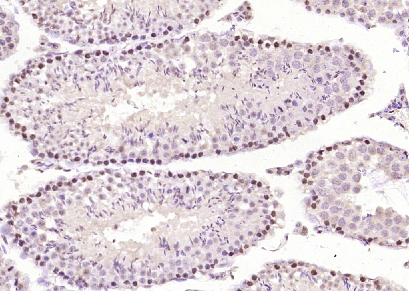 Paraformaldehyde-fixed, paraffin embedded (mouse testis tissue); Antigen retrieval by boiling in sodium citrate buffer (pH6.0) for 15min; Block endogenous peroxidase by 3% hydrogen peroxide for 20 minutes; Blocking buffer (normal goat serum) at 37°C for 30min; Antibody incubation with (HMGB4) Polyclonal Antibody, Unconjugated (bs-1820R) at 1:400 overnight at 4°C, followed by operating according to SP Kit(Rabbit) (sp-0023) instructionsand DAB staining.