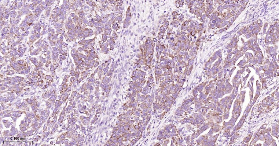 Paraformaldehyde-fixed, paraffin embedded Human Ovarian Cancer; Antigen retrieval by boiling in sodium citrate buffer (pH6.0) for 15 min; Antibody incubation with CPT1A Polyclonal Antibody, Unconjugated (bs-2047R) at 1:200 overnight at 4°C, followed by conjugation to the bs-0295G-HRP and DAB (C-0010) staining.