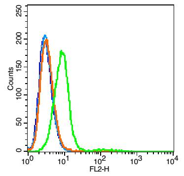 The cells were fixed with 2% paraformaldehyde (10 min). Primary antibody (bs-2095R, 1μg /1x10^6 cells) were incubated for 30 min on the ice, followed by 1 X PBS containing 0.5% BSA + 1 0% goat serum (15 min) to block non-specific protein-protein interactions. Then the Goat Anti-rabbit IgG/PE antibody was added into the blocking buffer mentioned above to react with the primary antibody at 1/200 dilution for 30 min on ice. Acquisition of 20,000 events was performed.