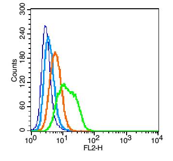 Blank control: U937(blue). Primary Antibody: Rabbit Anti- Integrin alpha 1 antibody(bs-2095R), Dilution: 1μg in 100 μL 1X PBS containing 0.5% BSA; Isotype Control Antibody: Rabbit IgG(orange) ,used under the same conditions ); Secondary Antibody: Goat anti-rabbit IgG-PE(white blue), Dilution: 1:200 in 1 X PBS containing 0.5% BSA.