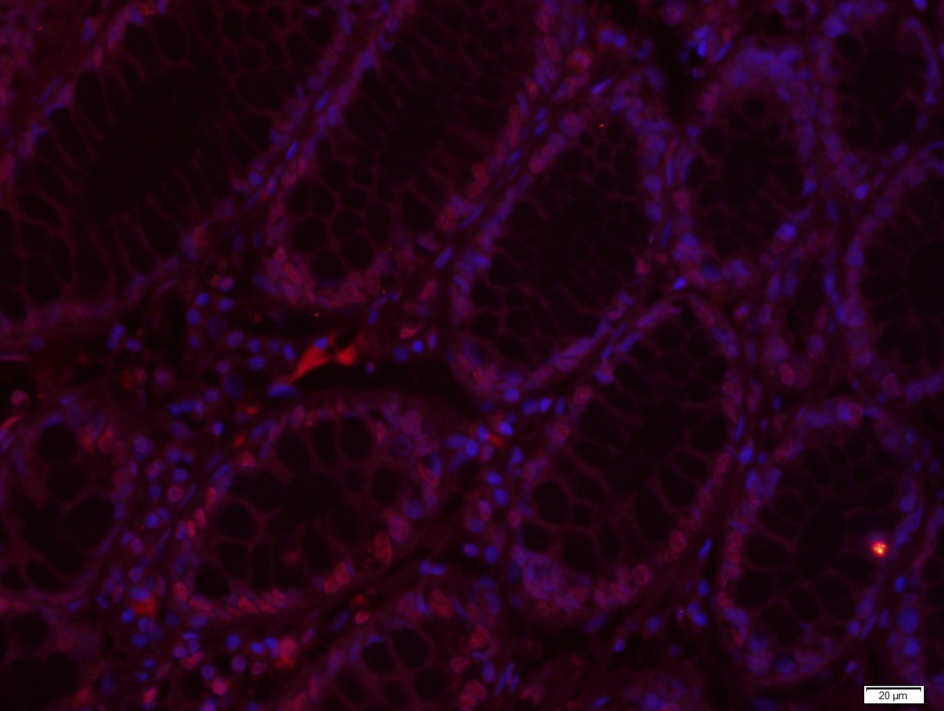 Paraformaldehyde-fixed, paraffin embedded (Human colon cancer); Antigen retrieval by boiling in sodium citrate buffer (pH6.0) for 15min; Block endogenous peroxidase by 3% hydrogen peroxide for 20 minutes; Blocking buffer (normal goat serum) at 37°C for 30min; Antibody incubation with (PAX5) Polyclonal Antibody, Unconjugated (bs-1861R) at 1:400 overnight at 4°C, followed by a conjugated Goat Anti-Rabbit IgG antibody (bs-0295G-cy3) for 90 minutes, and DAPI for nuclei staining.