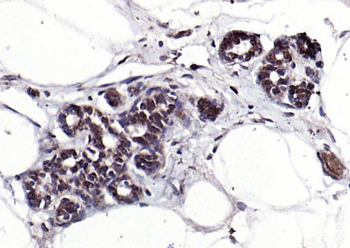 Paraformaldehyde-fixed, paraffin embedded (rat breast); Antigen retrieval by boiling in sodium citrate buffer (pH6.0) for 15min; Block endogenous peroxidase by 3% hydrogen peroxide for 20 minutes; Blocking buffer (normal goat serum) at 37°C for 30min; Antibody incubation with (SPDEF) Polyclonal Antibody, Unconjugated (bs-1866R) at 1:200 overnight at 4°C, followed by operating according to SP Kit(Rabbit) (sp-0023) instructionsand DAB staining.