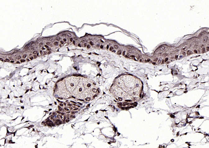 Paraformaldehyde-fixed, paraffin embedded (mouse skin); Antigen retrieval by boiling in sodium citrate buffer (pH6.0) for 15min; Block endogenous peroxidase by 3% hydrogen peroxide for 20 minutes; Blocking buffer (normal goat serum) at 37°C for 30min; Antibody incubation with (SPDEF) Polyclonal Antibody, Unconjugated (bs-1866R) at 1:200 overnight at 4°C, followed by operating according to SP Kit(Rabbit) (sp-0023) instructionsand DAB staining.