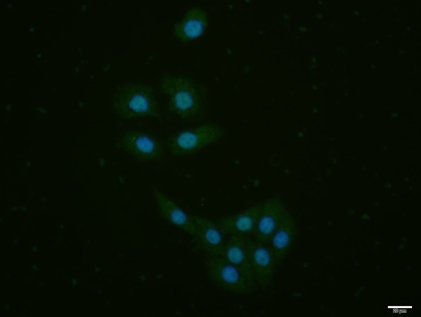 MCF-7 cell; 4% Paraformaldehyde-fixed; Triton X-100 at room temperature for 20 min; Blocking buffer (normal goat serum, C-0005) at 37°C for 20 min; Antibody incubation with (SPDEF) polyclonal Antibody, Unconjugated (bs-1866R) 1:100, 90 minutes at 37°C; followed by a conjugated Goat Anti-Rabbit IgG antibody at 37°C for 90 minutes, DAPI (blue, C02-04002) was used to stain the cell nuclei.