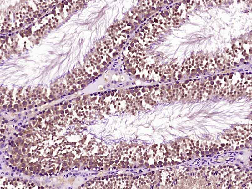 Paraformaldehyde-fixed, paraffin embedded (Rat testis); Antigen retrieval by boiling in sodium citrate buffer (pH6.0) for 15min; Block endogenous peroxidase by 3% hydrogen peroxide for 20 minutes; Blocking buffer (normal goat serum) at 37°C for 30min; Antibody incubation with (Securin) Polyclonal Antibody, Unconjugated (bs-1881R) at 1:400 overnight at 4°C, followed by operating according to SP Kit(Rabbit) (sp-0023) instructionsand DAB staining.