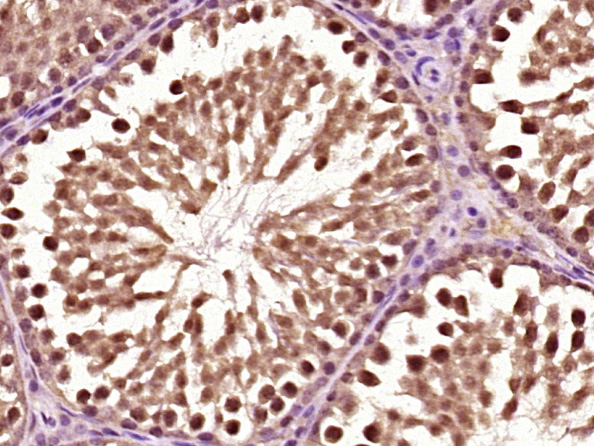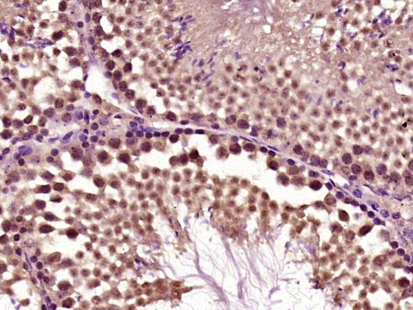 Paraformaldehyde-fixed, paraffin embedded (Mouse testis); Antigen retrieval by boiling in sodium citrate buffer (pH6.0) for 15min; Block endogenous peroxidase by 3% hydrogen peroxide for 20 minutes; Blocking buffer (normal goat serum) at 37°C for 30min; Antibody incubation with (Zfp91) Polyclonal Antibody, Unconjugated (bs-1941R) at 1:400 overnight at 4°C, followed by a conjugated secondary antibody (sp-0023) for 20 minutes and DAB staining.