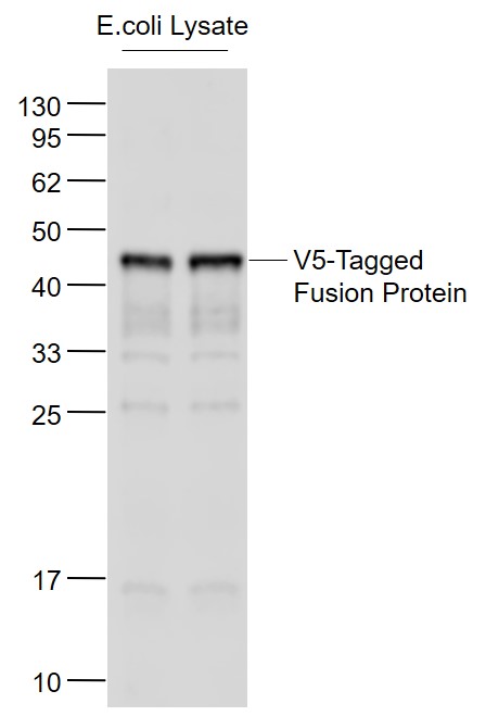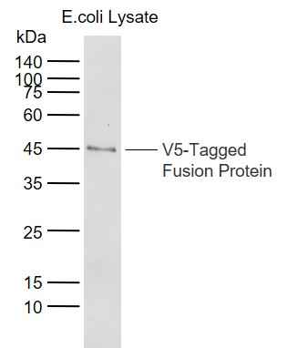 Sample: Lane1: V5-Tagged Fusion Protein Overexpression E.coli Lysate at 2ug Lane2: V5-Tagged Fusion Protein Overexpression E.coli Lysate at 2ug Primary: Anti-V5 tag (bs-2109R) at 1/1000 dilution Secondary: IRDye800CW Goat Anti-Rabbit IgG at 1/20000 dilution Predicted band size: 41 kD Observed band size: 45 kD