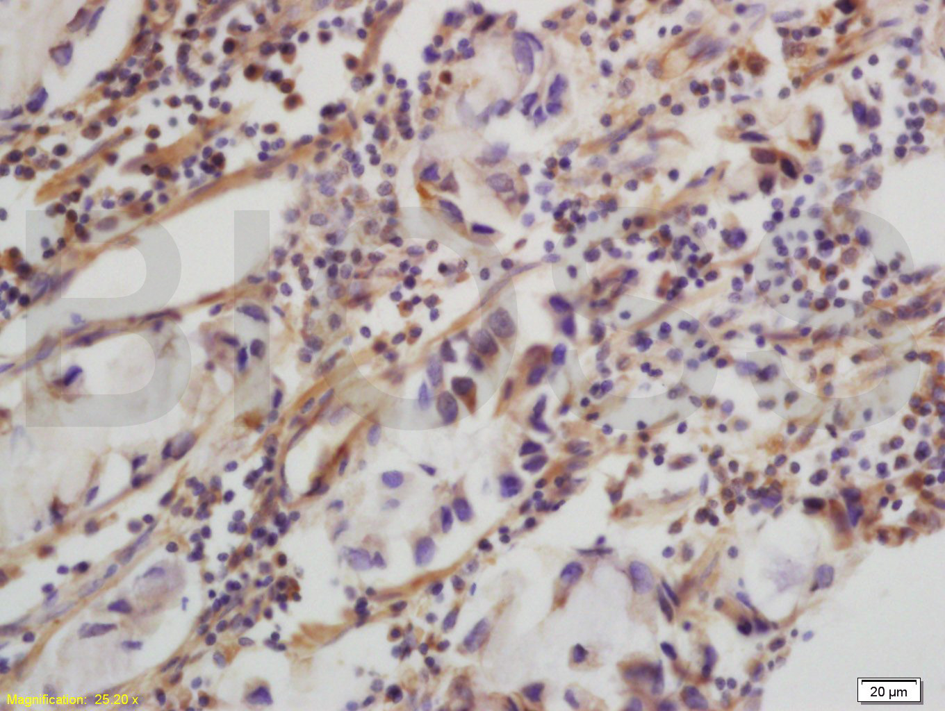Paraformaldehyde-fixed, paraffin embedded (human gastric carcinoma); Antigen retrieval by boiling in sodium citrate buffer (pH6.0) for 15min; Block endogenous peroxidase by 3% hydrogen peroxide for 20 minutes; Blocking buffer (normal goat serum) at 37°C for 30min; Antibody incubation with (CLEC5A) Polyclonal Antibody, Unconjugated (bs-2663R) at 1:200 overnight at 4°C, followed by operating according to SP Kit(Rabbit) (sp-0023) instructionsand DAB staining.