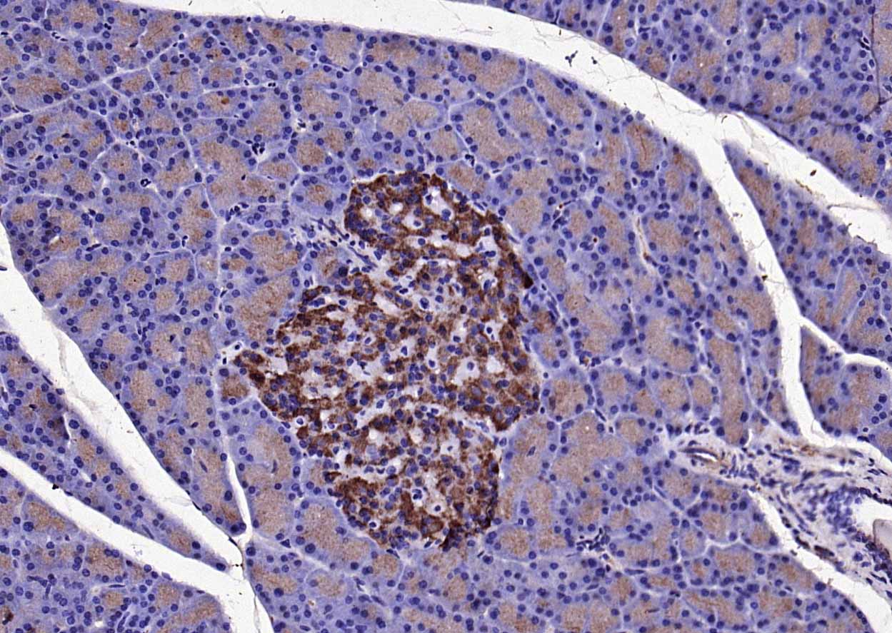 Paraformaldehyde-fixed, paraffin embedded (mouse pancreas); Antigen retrieval by boiling in sodium citrate buffer (pH6.0) for 15min; Block endogenous peroxidase by 3% hydrogen peroxide for 20 minutes; Blocking buffer (normal goat serum) at 37°C for 30min; Antibody incubation with (KLK1) Polyclonal Antibody, Unconjugated (bs-1963R) at 1:200 overnight at 4°C, followed by operating according to SP Kit(Rabbit) (sp-0023) instructionsand DAB staining.