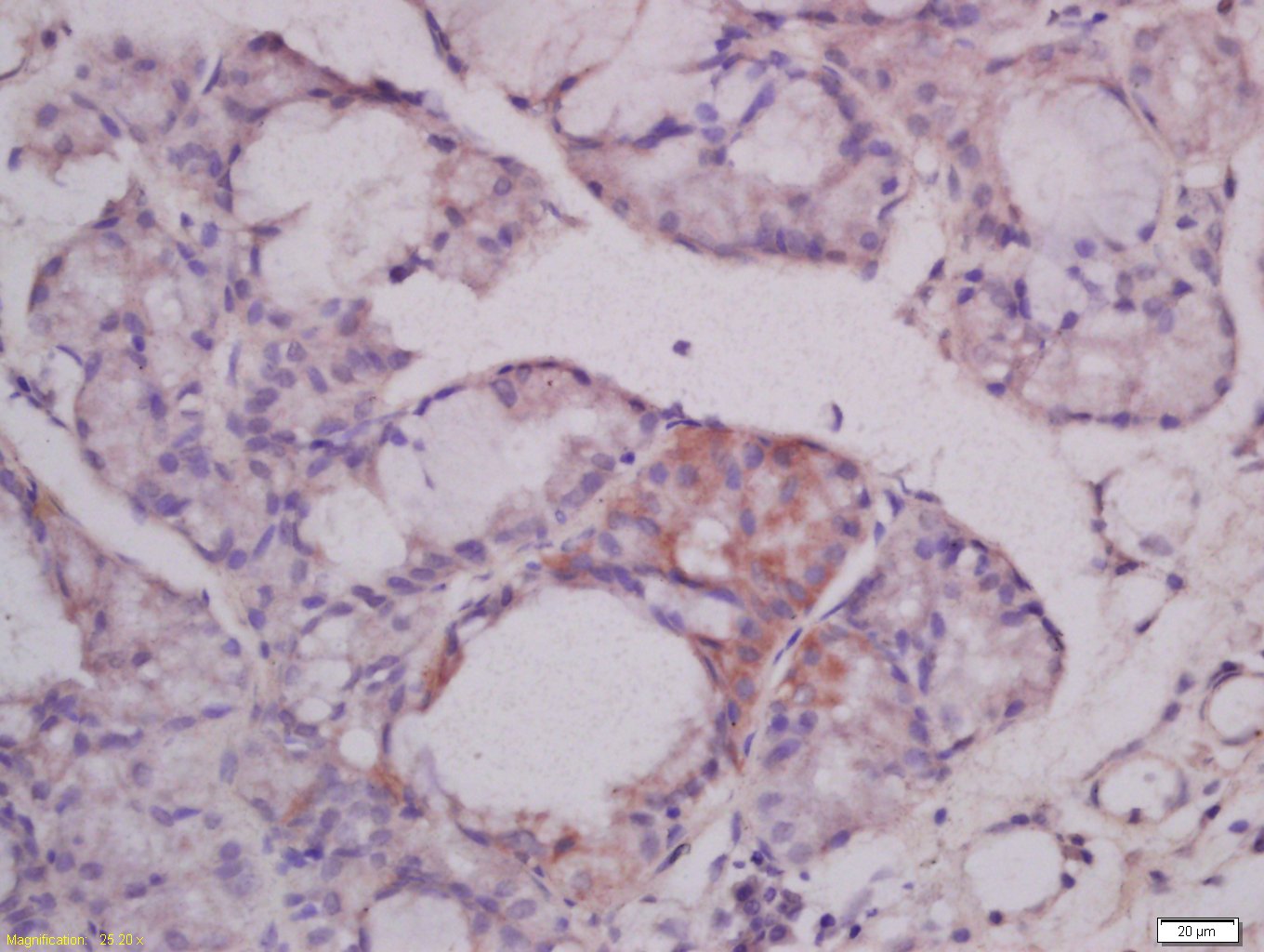Paraformaldehyde-fixed, paraffin embedded (Human oral squamous cell carcinoma); Antigen retrieval by boiling in sodium citrate buffer (pH6.0) for 15min; Block endogenous peroxidase by 3% hydrogen peroxide for 20 minutes; Blocking buffer (normal goat serum) at 37°C for 30min; Antibody incubation with (Muc4) Polyclonal Antibody, Unconjugated (bs-1994R) at 1:500 overnight at 4°C, followed by a conjugated secondary (sp-0023) for 20 minutes and DAB staining.