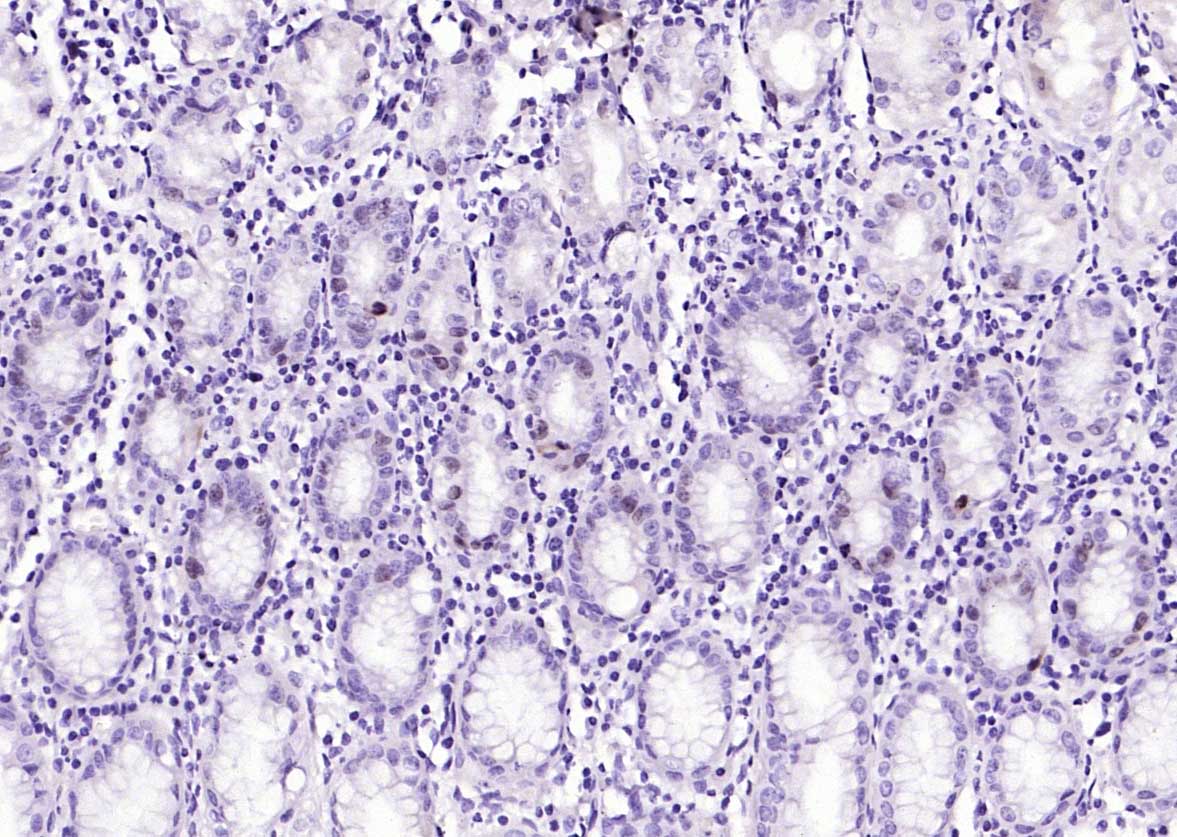 Paraformaldehyde-fixed, paraffin embedded (Human stomach); Antigen retrieval by boiling in sodium citrate buffer (pH6.0) for 15min; Block endogenous peroxidase by 3% hydrogen peroxide for 20 minutes; Blocking buffer (normal goat serum) at 37°C for 30min; Antibody incubation with (Ki-67) Polyclonal Antibody, Unconjugated (bs-2130R) at 1:200 overnight at 4°C, followed by operating according to SP Kit(Rabbit) (sp-0023) instructionsand DAB staining.