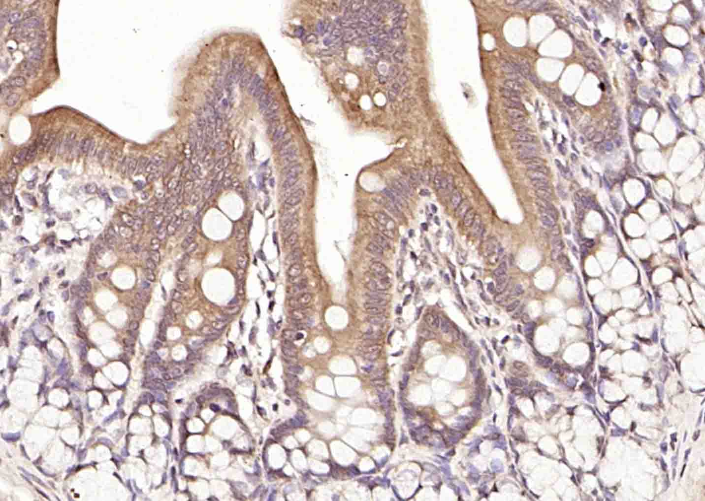 Paraformaldehyde-fixed, paraffin embedded (mouse colon); Antigen retrieval by boiling in sodium citrate buffer (pH6.0) for 15min; Block endogenous peroxidase by 3% hydrogen peroxide for 20 minutes; Blocking buffer (normal goat serum) at 37°C for 30min; Incubation with (Axin1) Polyclonal Antibody, Unconjugated (bs-2439R) at 1:200 overnight at 4°C, followed by operating according to SP Kit(Rabbit) (sp-0023) instructionsand DAB staining.