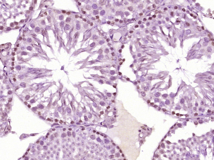 Paraformaldehyde-fixed, paraffin embedded (mouse testis tissue); Antigen retrieval by boiling in sodium citrate buffer (pH6.0) for 15min; Block endogenous peroxidase by 3% hydrogen peroxide for 20 minutes; Blocking buffer (normal goat serum) at 37°C for 30min; Antibody incubation with (HOXA10) Polyclonal Antibody, Unconjugated (bs-2502R) at 1:400 overnight at 4°C, followed by operating according to SP Kit(Rabbit) (sp-0023) instructionsand DAB staining