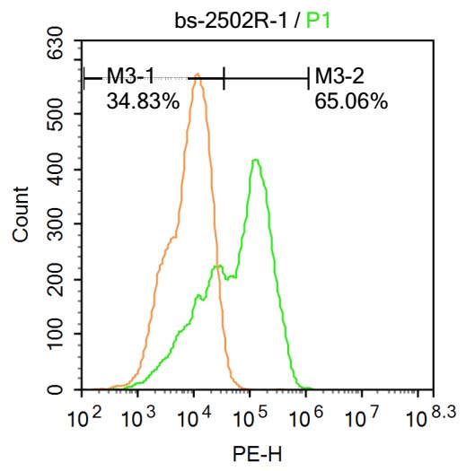 U-937 cells were fixed with 4% PFA for 10min at room temperature,permeabilized with 90% ice-cold methanol for 20 min at room temperature,and incubated in 5% BSA blocking buffer for 30 min at room temperature. Cells were then stained with HOXA10 Antibody(bs-2502R) at 1:100 dilution in blocking buffer and incubated for 30 min at room temperature, washed twice with 2%BSA in PBS, followed by secondary antibody incubation for 40 min at room temperature. Acquisitions of 20,000 events were performed.Cells stained with primary antibody (green), and isotype control (orange).