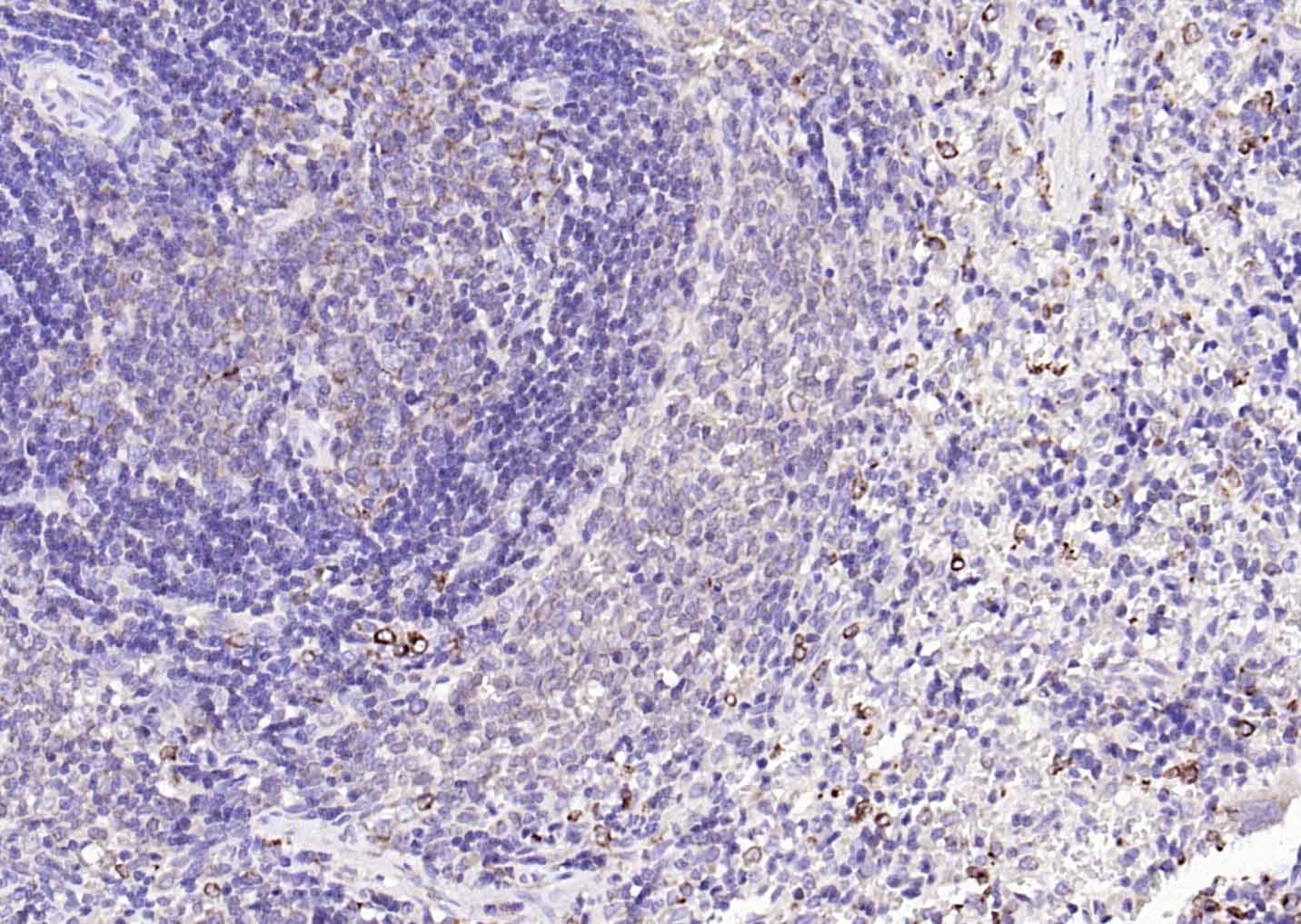Paraformaldehyde-fixed, paraffin embedded Mouse Lymph; Antigen retrieval by boiling in sodium citrate buffer (pH6.0) for 15 min; Antibody incubation with CD74 Polyclonal Antibody, Unconjugated (bs-2518R) at 1:200 overnight at 4°C, followed by conjugation to the bs-0295G-HRP and DAB (C-0010) staining.