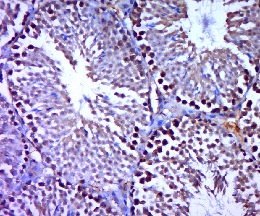 Paraformaldehyde-fixed, paraffin embedded (mouse testis tissue); Antigen retrieval by boiling in sodium citrate buffer (pH6.0) for 15min; Block endogenous peroxidase by 3% hydrogen peroxide for 20 minutes; Blocking buffer (normal goat serum) at 37°C for 30min; Antibody incubation with (SREBP2) Polyclonal Antibody, Unconjugated (bs-2536R) at 1:400 overnight at 4°C, followed by a conjugated secondary (sp-0024) for 20 minutes and DAB staining.
