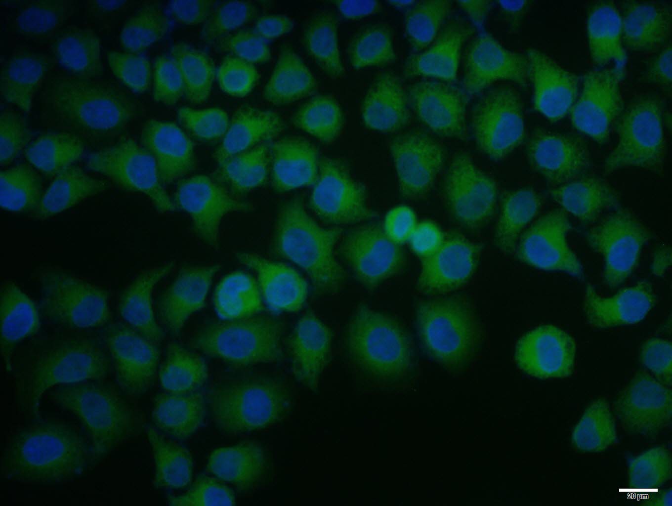 HepG2 cell; 4% Paraformaldehyde-fixed; Triton X-100 at room temperature for 20 min; Blocking buffer (normal goat serum, C-0005) at 37°C for 20 min; Antibody incubation with (SREBP2) polyclonal Antibody, Unconjugated (bs-2536R) 1:100, 90 minutes at 37°C; followed by a conjugated Goat Anti-Rabbit IgG antibody at 37°C for 90 minutes, DAPI (blue, C02-04002) was used to stain the cell nuclei.