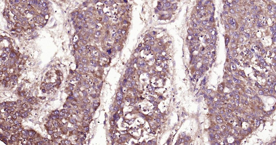 Paraformaldehyde-fixed, paraffin embedded Human Breast Cancer; Antigen retrieval by boiling in sodium citrate buffer (pH6.0) for 15 min; Antibody incubation with GLUT12 Polyclonal Antibody, Unconjugated (bs-2540R) at 1:200 overnight at 4°C, followed by conjugation to the bs-0295G-HRP and DAB (C-0010) staining.