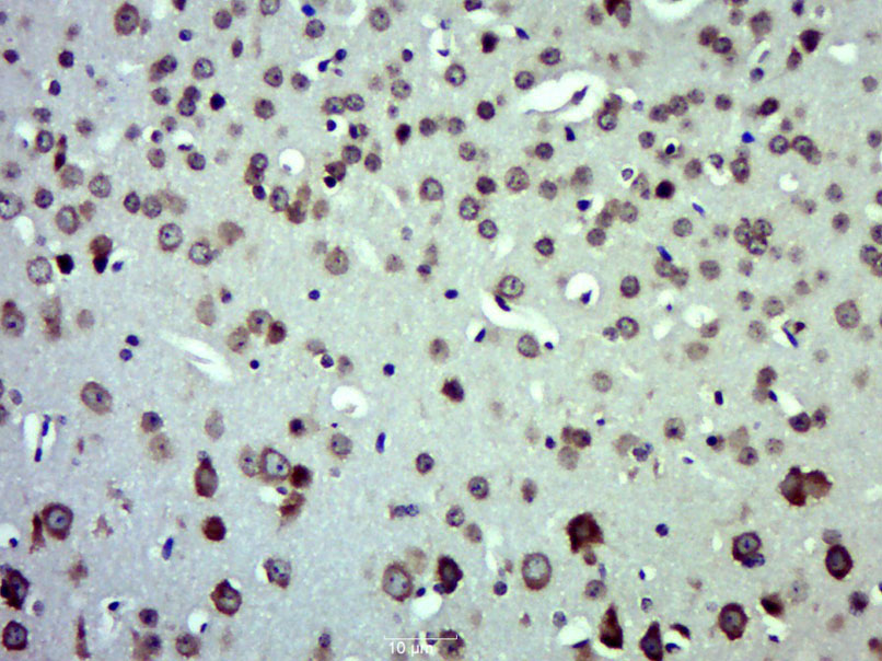Paraformaldehyde-fixed, paraffin embedded (Mouse brain); Antigen retrieval by boiling in sodium citrate buffer (pH6.0) for 15min; Block endogenous peroxidase by 3% hydrogen peroxide for 20 minutes; Blocking buffer (normal goat serum) at 37°C for 30min; Antibody incubation with (CXCL11) Polyclonal Antibody, Unconjugated (bs-2552R) at 1:400 overnight at 4°C, followed by operating according to SP Kit(Rabbit) (sp-0023) instructionsand DAB staining.