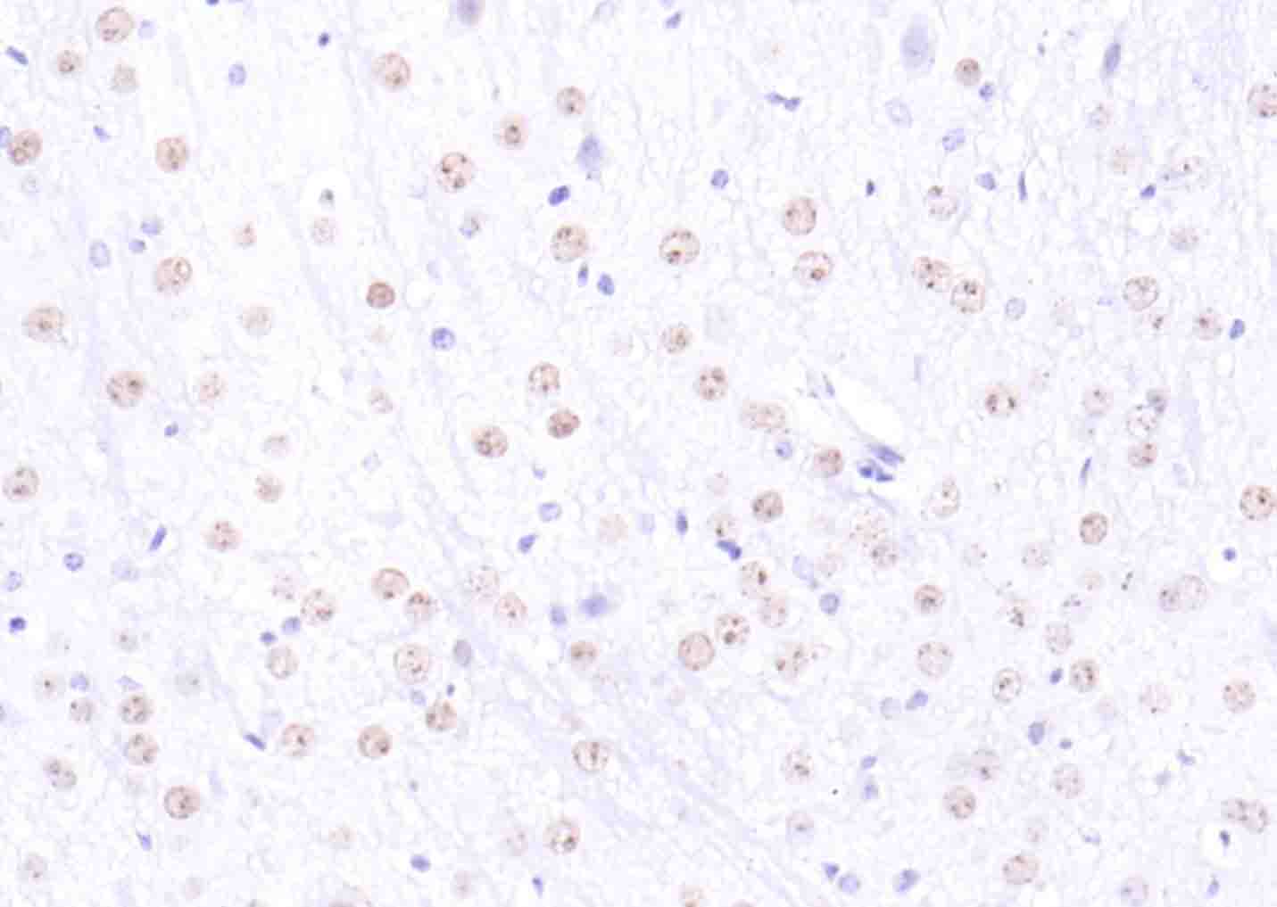 Paraformaldehyde-fixed, paraffin embedded (rat brain); Antigen retrieval by boiling in sodium citrate buffer (pH6.0) for 15min; Block endogenous peroxidase by 3% hydrogen peroxide for 20 minutes; Blocking buffer (normal goat serum) at 37°C for 30min; Antibody incubation with (H2AX) Polyclonal Antibody, Unconjugated (bs-2560R) at 1:200 overnight at 4°C, followed by operating according to SP Kit(Rabbit) (sp-0023) instructionsand DAB staining.