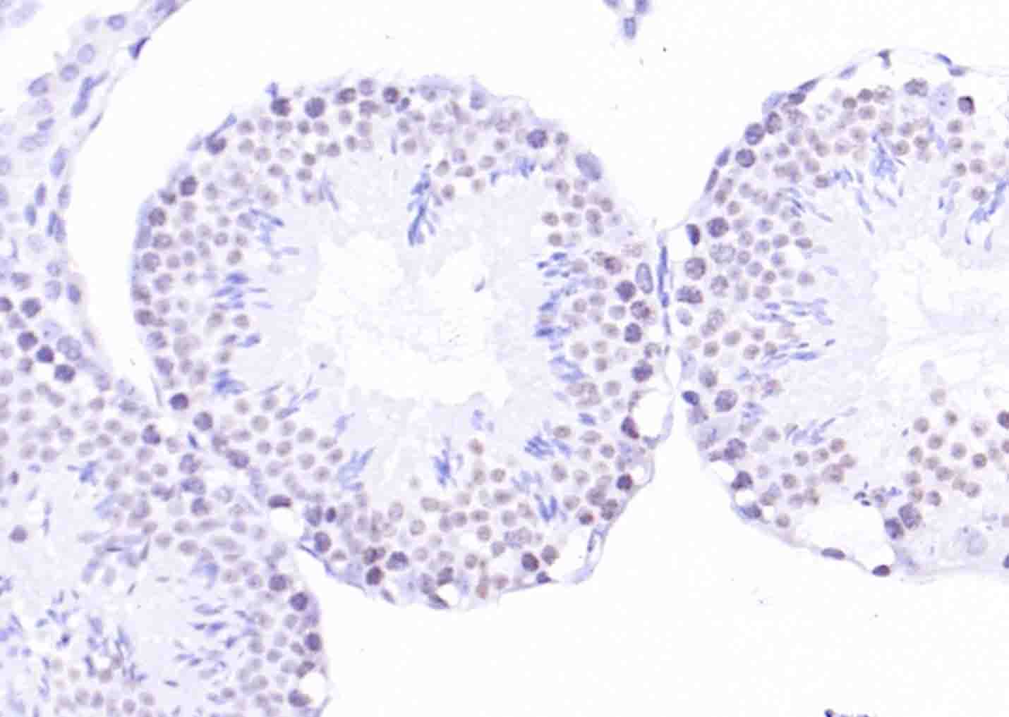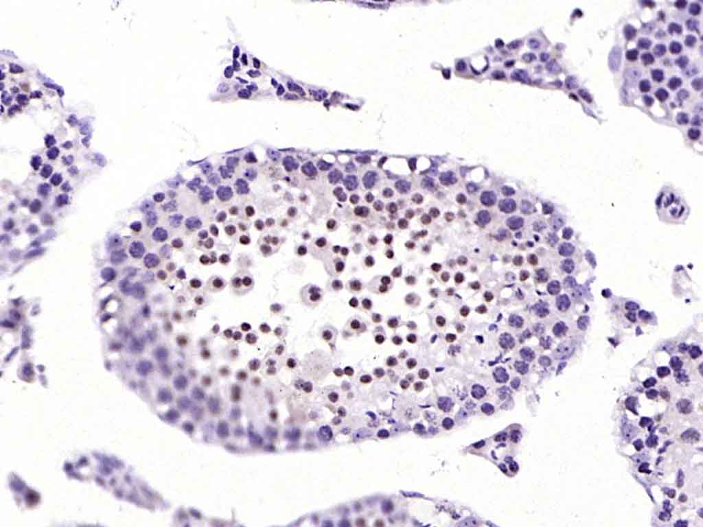 Paraformaldehyde-fixed, paraffin embedded (mouse testis); Antigen retrieval by boiling in sodium citrate buffer (pH6.0) for 15min; Block endogenous peroxidase by 3% hydrogen peroxide for 20 minutes; Blocking buffer (normal goat serum) at 37°C for 30min; Antibody incubation with (Histone H2A.x) Polyclonal Antibody, Unconjugated (bs-2560R ) at 1:200 overnight at 4°C, followed by operating according to SP Kit(Rabbit) (sp-0023) instructionsand DAB staining.