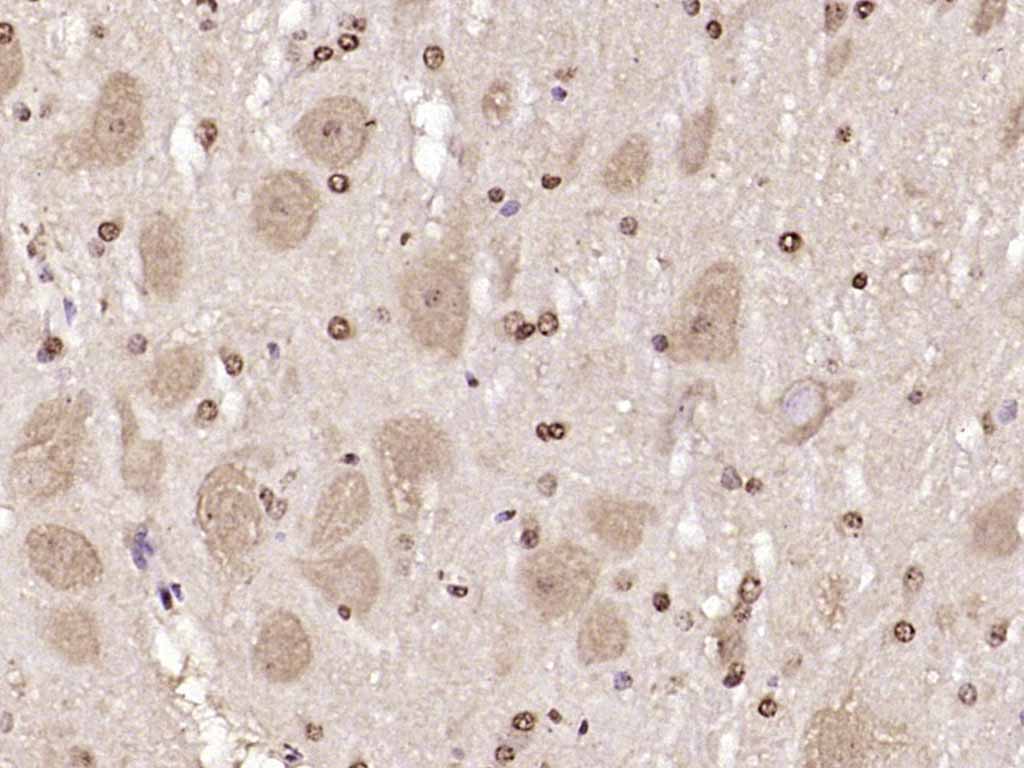 Paraformaldehyde-fixed, paraffin embedded (mouse brain); Antigen retrieval by boiling in sodium citrate buffer (pH6.0) for 15min; Block endogenous peroxidase by 3% hydrogen peroxide for 20 minutes; Blocking buffer (normal goat serum) at 37°C for 30min; Antibody incubation with (JNK1+JNK2+JNK3) Polyclonal Antibody, Unconjugated (bs-2592R) at 1:200 overnight at 4°C, followed by operating according to SP Kit(Rabbit) (sp-0023) instructionsand DAB staining.