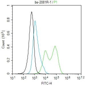 Blank control:THP-1. Primary Antibody (green line): Rabbit Anti-TNF alpha antibody (bs-2081R) Dilution: 1ug/Test; Secondary Antibody : Goat anti-rabbit IgG-BF488 Dilution: 0.5ug/Test. The cells were treated with TPA (80 nM, overnight) and then treated with LPS (1 ug/mL, 18 hr/6 hr) and Brefeldin A (300 ng/mL, last 3 hr of stimulation) .The cells were fixed with 4% PFA (10min at room temperature)and then permeabilized with 90% ice-cold methanol for 20 min at -20℃.The cells were then incubated in 5%BSA to block non-specific protein-protein interactions for 30 min at room temperature .Cells stained with Primary Antibody for 30 min at room temperature. The secondary antibody used for 40 min at room temperature. Acquisition of 20,000 events was performed.