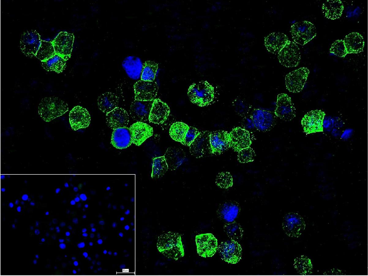 LPS(100 ng/ml, 16 h) and Brefeldin A treated (5 μg/ml,4 h)(H) THP-1cells; Antibody incubation with (TNF alpha) polyclonal Antibody, unconjugated (bs-2081R) 1:100, 90 min at 37°C; followed by conjugated Goat Anti-Rabbit IgG antibody (green, bs-60295G-BF488) at 37°C for 90 min, DAPI (blue, C02-04002) was used to stain the cell nuclei. PBS instead of the primary antibody was used as the blank control.