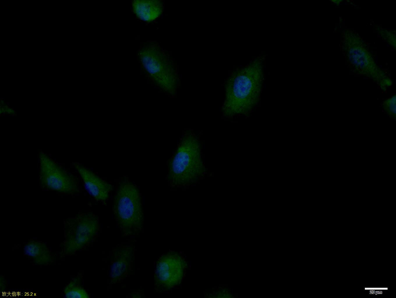 A549 cell; 4% Paraformaldehyde-fixed; Triton X-100 at room temperature for 20 min; Blocking buffer (normal goat serum, C-0005) at 37°C for 20 min; Antibody incubation with (phospho-IRS1 (Ser636 + Ser639)) polyclonal Antibody, Unconjugated (bs-3201R) 1:100, 90 minutes at 37°C; followed by a conjugated Goat Anti-Rabbit IgG antibody at 37°C for 90 minutes, DAPI (blue, C02-04002) was used to stain the cell nuclei.