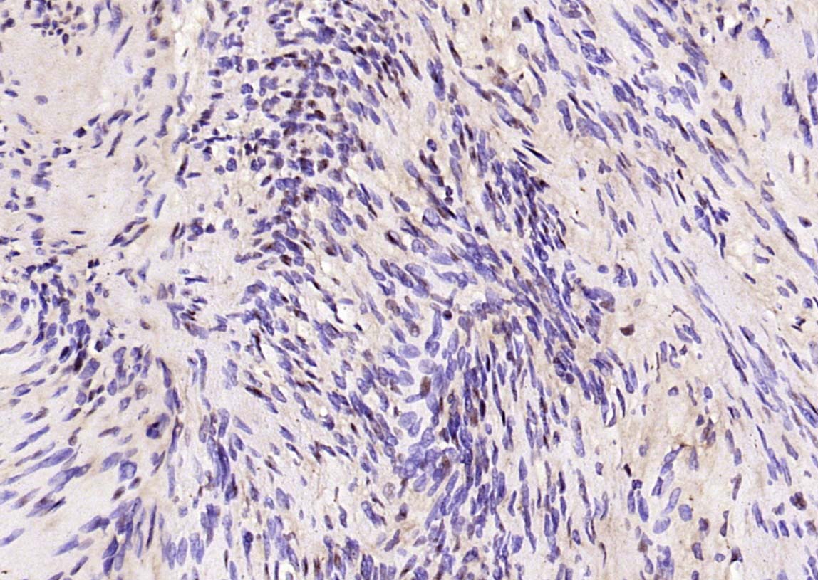 Paraformaldehyde-fixed, paraffin embedded (human Glioblastoma); Antigen retrieval by boiling in sodium citrate buffer (pH6.0) for 15min; Block endogenous peroxidase by 3% hydrogen peroxide for 20 minutes; Blocking buffer (normal goat serum) at 37°C for 30min; Antibody incubation with (phospho-ERK12 (Thr202 + Tyr204)) Polyclonal Antibody, Unconjugated (bs-3016R) at 1:2000 overnight at 4°C, followed by operating according to SP Kit(Rabbit) (sp-0023) instructionsand DAB staining.