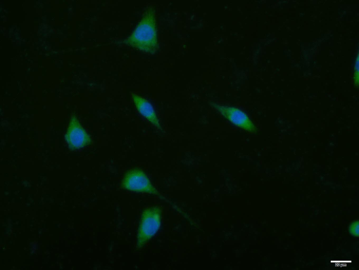 NIH/3T3 cell; 4% Paraformaldehyde-fixed; Triton X-100 at room temperature for 20 min; Blocking buffer (normal goat serum, C-0005) at 37°C for 20 min; Antibody incubation with (ACACA) polyclonal Antibody, Unconjugated (bs-2745R) 1:100, 90 minutes at 37°C; followed by a conjugated Goat Anti-Rabbit IgG antibody at 37°C for 90 minutes, DAPI (blue, C02-04002) was used to stain the cell nuclei.