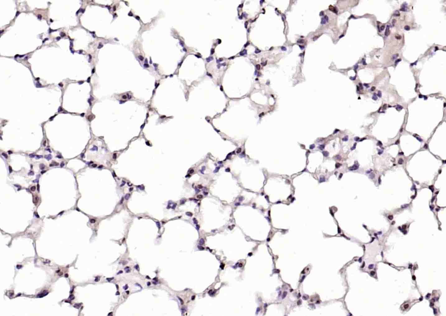 Paraformaldehyde-fixed, paraffin embedded (rat lung); Antigen retrieval by boiling in sodium citrate buffer (pH6.0) for 15min; Block endogenous peroxidase by 3% hydrogen peroxide for 20 minutes; Blocking buffer (normal goat serum) at 37°C for 30min; Incubation with (phospho-c-Abl (Tyr226)) Polyclonal Antibody, Unconjugated (bs-3041R) at 1:200 overnight at 4°C, followed by operating according to SP Kit(Rabbit) (sp-0023) instructionsand DAB staining.