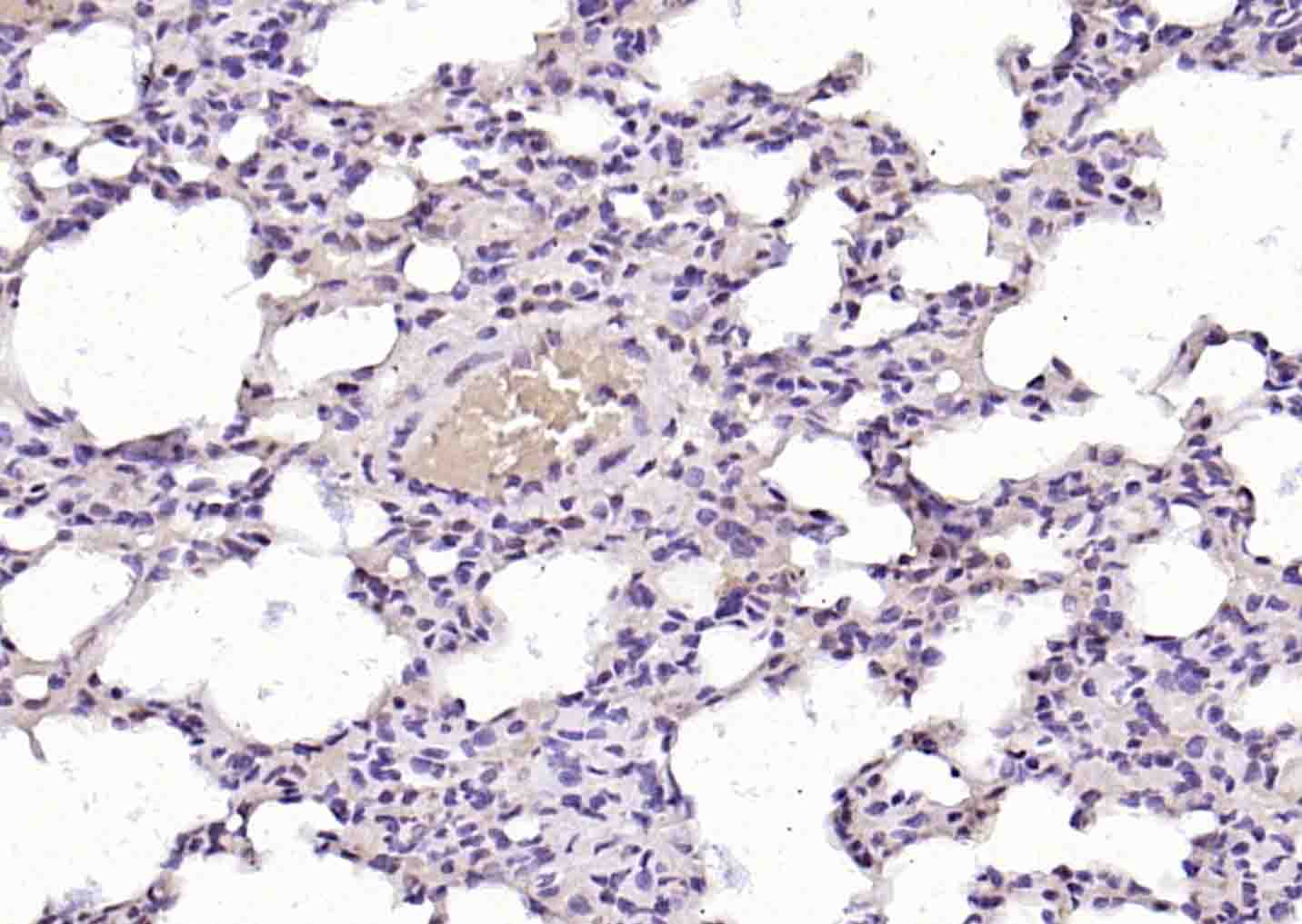 Paraformaldehyde-fixed, paraffin embedded (mouse lung); Antigen retrieval by boiling in sodium citrate buffer (pH6.0) for 15min; Block endogenous peroxidase by 3% hydrogen peroxide for 20 minutes; Blocking buffer (normal goat serum) at 37°C for 30min; Incubation with (phospho-c-Abl (Tyr226)) Polyclonal Antibody, Unconjugated (bs-3041R) at 1:200 overnight at 4°C, followed by operating according to SP Kit(Rabbit) (sp-0023) instructionsand DAB staining.