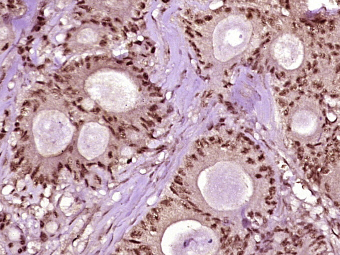 Paraformaldehyde-fixed, paraffin embedded (human colon carcinoma); Antigen retrieval by boiling in sodium citrate buffer (pH6.0) for 15min; Block endogenous peroxidase by 3% hydrogen peroxide for 20 minutes; Blocking buffer (normal goat serum) at 37°C for 30min; Antibody incubation with (CEBPA) Polyclonal Antibody, Unconjugated (bs-3061R) at 1:400 overnight at 4°C, followed by operating according to SP Kit(Rabbit) (sp-0023) instructionsand DAB staining.
