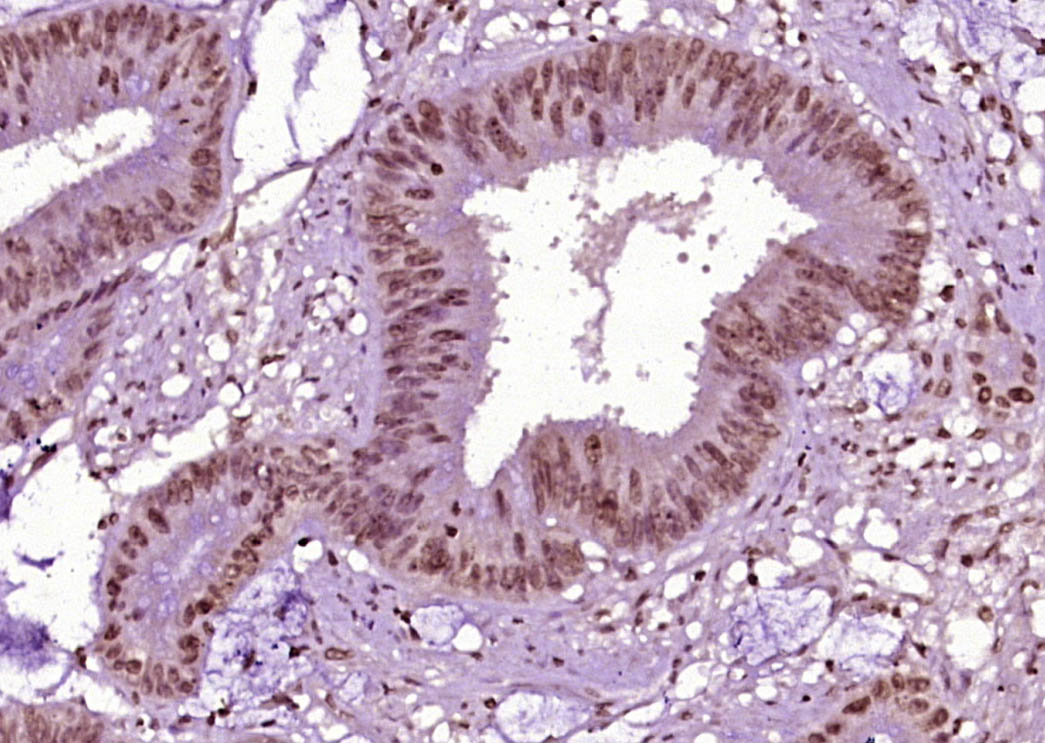 Paraformaldehyde-fixed, paraffin embedded (human colon carcinoma); Antigen retrieval by boiling in sodium citrate buffer (pH6.0) for 15min; Block endogenous peroxidase by 3% hydrogen peroxide for 20 minutes; Blocking buffer (normal goat serum) at 37°C for 30min; Antibody incubation with (Beta Catenin (Ser45)) Polyclonal Antibody, Unconjugated (bs-3085R) at 1:400 overnight at 4°C, followed by operating according to SP Kit(Rabbit) (sp-0023) instructionsand DAB staining.