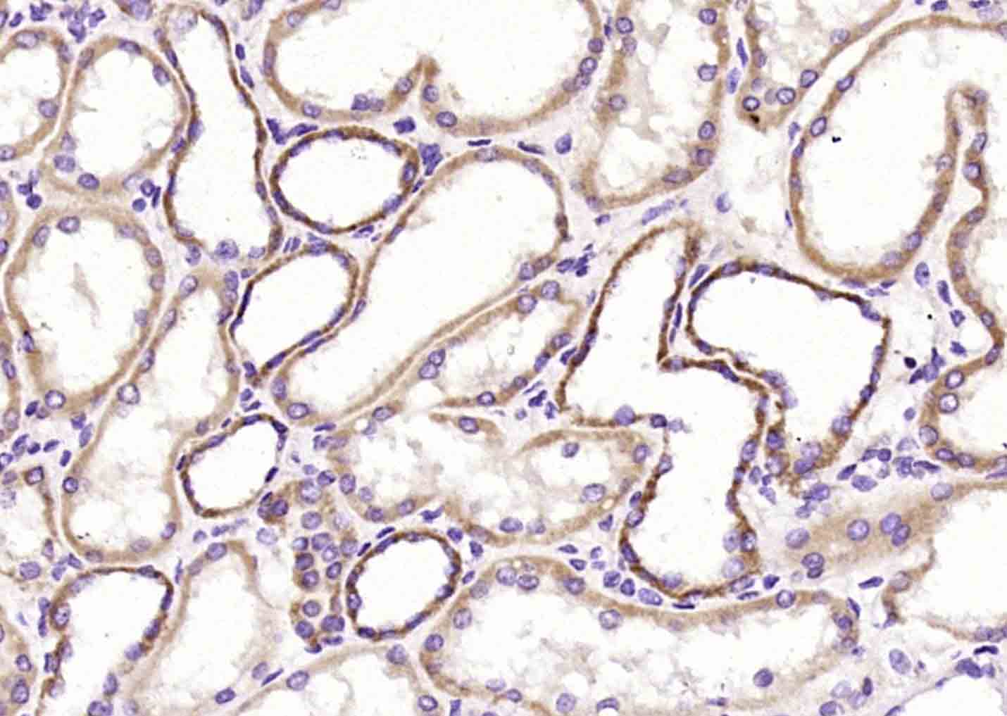Paraformaldehyde-fixed, paraffin embedded (Human kidney); Antigen retrieval by boiling in sodium citrate buffer (pH6.0) for 15min; Block endogenous peroxidase by 3% hydrogen peroxide for 20 minutes; Blocking buffer (normal goat serum) at 37°C for 30min; Antibody incubation with (Phospho-GRB10 (Tyr67)) Polyclonal Antibody, Unconjugated (bs-3157R) at 1:200 overnight at 4°C, followed by operating according to SP Kit(Rabbit) (sp-0023) instructionsand DAB staining.