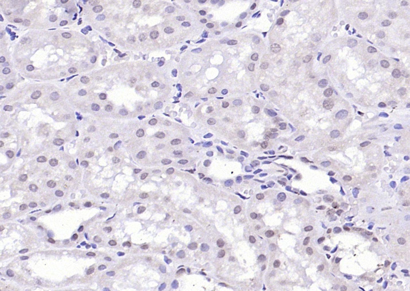 Paraformaldehyde-fixed, paraffin embedded (Human kidney); Antigen retrieval by boiling in sodium citrate buffer (pH6.0) for 15min; Block endogenous peroxidase by 3% hydrogen peroxide for 20 minutes; Blocking buffer (normal goat serum) at 37°C for 30min; Antibody incubation with (KLF2) Polyclonal Antibody, Unconjugated (bs-2772R) at 1:200 overnight at 4°C, followed by operating according to SP Kit(Rabbit) (sp-0023) instructionsand DAB staining.