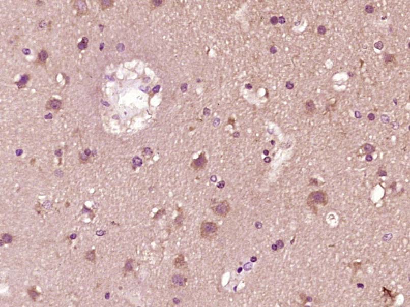 Paraformaldehyde-fixed, paraffin embedded (Mouse brain); Antigen retrieval by boiling in sodium citrate buffer (pH6.0) for 15min; Block endogenous peroxidase by 3% hydrogen peroxide for 20 minutes; Blocking buffer (normal goat serum) at 37°C for 30min; Antibody incubation with (Phospho-IRF7 (Ser471 + Ser472)) Polyclonal Antibody, Unconjugated (bs-3196R) at 1:400 overnight at 4°C, followed by operating according to SP Kit(Rabbit) (sp-0023) instructionsand DAB staining.