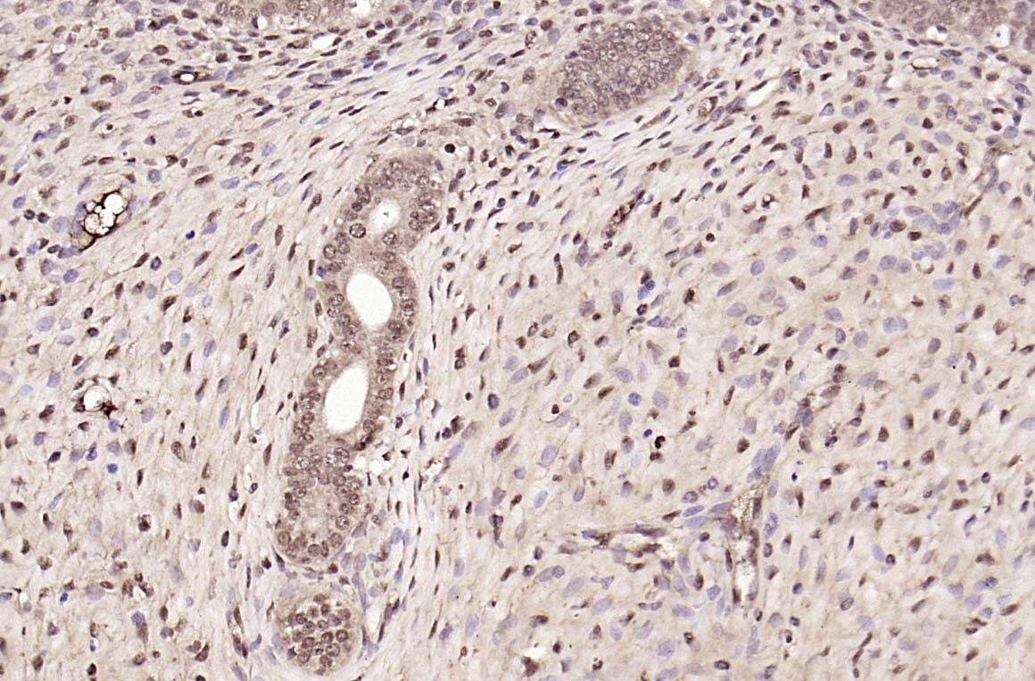 Paraformaldehyde-fixed, paraffin embedded (rat uterus); Antigen retrieval by boiling in sodium citrate buffer (pH6.0) for 15min; Block endogenous peroxidase by 3% hydrogen peroxide for 20 minutes; Blocking buffer (normal goat serum) at 37°C for 30min; Antibody incubation with (phospho-IRS1 (Tyr1229)) Polyclonal Antibody, Unconjugated (bs-3203R) at 1:200 overnight at 4°C, followed by operating according to SP Kit(Rabbit) (sp-0023) instructionsand DAB staining.