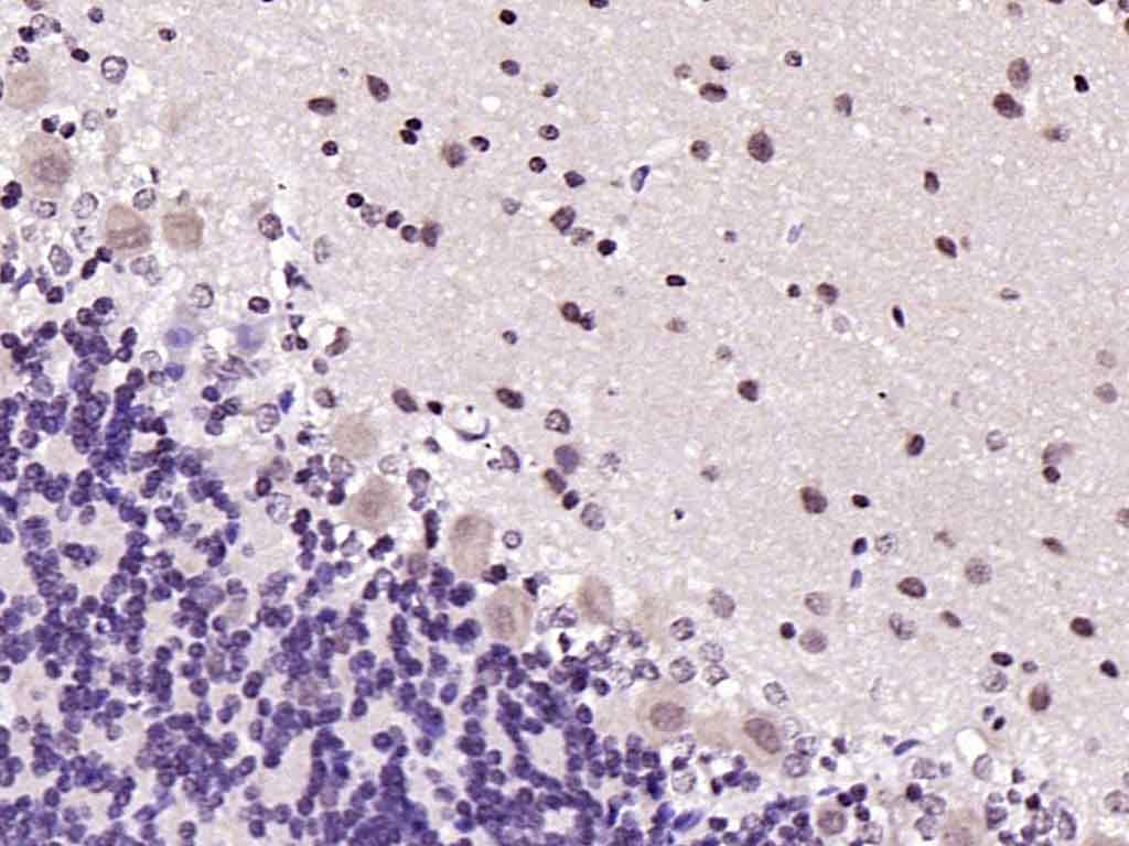 Paraformaldehyde-fixed, paraffin embedded (rat cerebellum); Antigen retrieval by boiling in sodium citrate buffer (pH6.0) for 15min; Block endogenous peroxidase by 3% hydrogen peroxide for 20 minutes; Blocking buffer (normal goat serum) at 37°C for 30min; Antibody incubation with (phospho-IRS1 (Tyr1229)) Polyclonal Antibody, Unconjugated (bs-3203R) at 1:200 overnight at 4°C, followed by operating according to SP Kit(Rabbit) (sp-0023) instructionsand DAB staining.