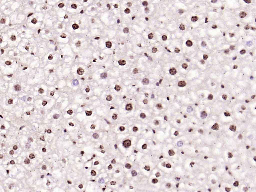 Paraformaldehyde-fixed, paraffin embedded (mouse liver); Antigen retrieval by boiling in sodium citrate buffer (pH6.0) for 15min; Block endogenous peroxidase by 3% hydrogen peroxide for 20 minutes; Blocking buffer (normal goat serum) at 37°C for 30min; Antibody incubation with (phospho-IRS1 (Tyr1229)) Polyclonal Antibody, Unconjugated (bs-3203R) at 1:200 overnight at 4°C, followed by operating according to SP Kit(Rabbit) (sp-0023) instructionsand DAB staining.