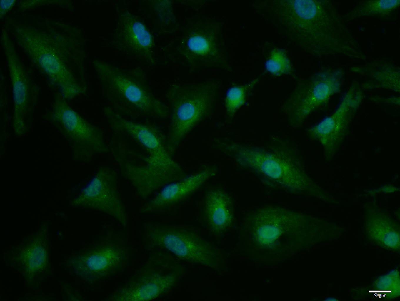 A549 cell; 4% Paraformaldehyde-fixed; Triton X-100 at room temperature for 20 min; Blocking buffer (normal goat serum, C-0005) at 37°C for 20 min; Antibody incubation with (phospho-IKK beta (Ser466)) polyclonal Antibody, Unconjugated (bs-3231R) 1:100, 90 minutes at 37°C; followed by a conjugated Goat Anti-Rabbit IgG antibody at 37°C for 90 minutes, DAPI (blue, C02-04002) was used to stain the cell nuclei.