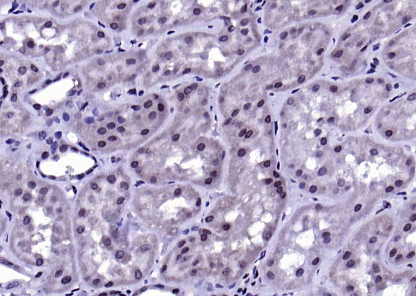 Paraformaldehyde-fixed, paraffin embedded (Human kidney); Antigen retrieval by boiling in sodium citrate buffer (pH6.0) for 15min; Block endogenous peroxidase by 3% hydrogen peroxide for 20 minutes; Blocking buffer (normal goat serum) at 37°C for 30min; Antibody incubation with (IKK beat) Polyclonal Antibody, Unconjugated (bs-3233R) at 1:200 overnight at 4°C, followed by operating according to SP Kit(Rabbit) (sp-0023) instructionsand DAB staining.