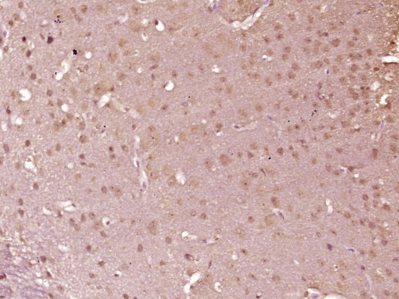 Paraformaldehyde-fixed, paraffin embedded (mouse brain); Antigen retrieval by boiling in sodium citrate buffer (pH6.0) for 15min; Block endogenous peroxidase by 3% hydrogen peroxide for 20 minutes; Blocking buffer (normal goat serum) at 37°C for 30min; Antibody incubation with (Phospho-IKK alpha,beta (Ser176 + Ser180)) Polyclonal Antibody, Unconjugated (bs-3237R) at 1:200 overnight at 4°C, followed by operating according to SP Kit(Rabbit) (sp-0023) instructionsand DAB staining.