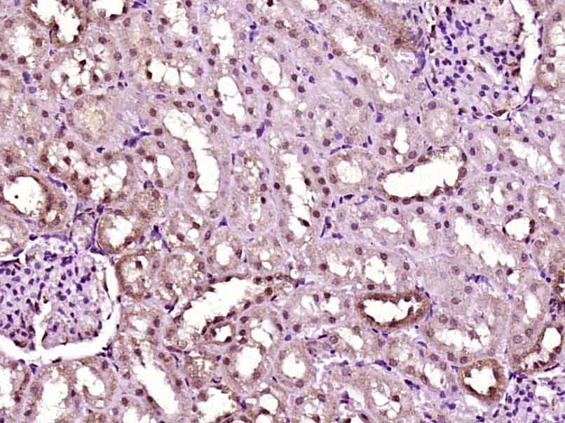 Paraformaldehyde-fixed, paraffin embedded (Rat kidney); Antigen retrieval by boiling in sodium citrate buffer (pH6.0) for 15min; Block endogenous peroxidase by 3% hydrogen peroxide for 20 minutes; Blocking buffer (normal goat serum) at 37°C for 30min; Antibody incubation with (Phospho-MAPKAPK2 (Thr222)) Polyclonal Antibody, Unconjugated (bs-3261R) at 1:400 overnight at 4°C, followed by operating according to SP Kit(Rabbit) (sp-0023) instructionsand DAB staining.