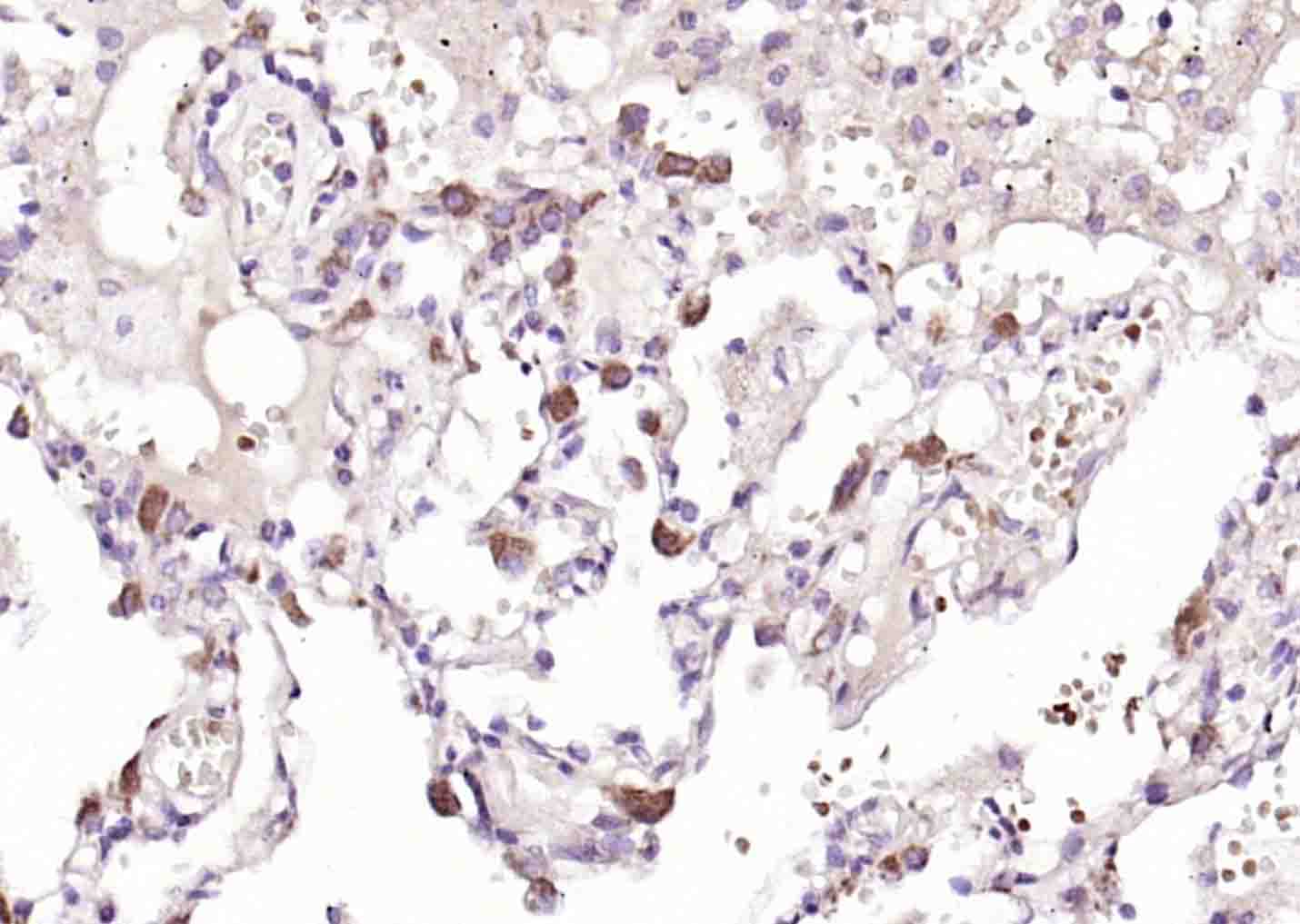 Paraformaldehyde-fixed, paraffin embedded (human lung carcinoma); Antigen retrieval by boiling in sodium citrate buffer (pH6.0) for 15min; Block endogenous peroxidase by 3% hydrogen peroxide for 20 minutes; Blocking buffer (normal goat serum) at 37°C for 30min; Incubation with (Phospho-MKK3(Ser218) + MKK6(Ser207)) Polyclonal Antibody, Unconjugated (bs-3274R) at 1:200 overnight at 4°C, followed by operating according to SP Kit(Rabbit) (sp-0023) instructionsand DAB staining.
