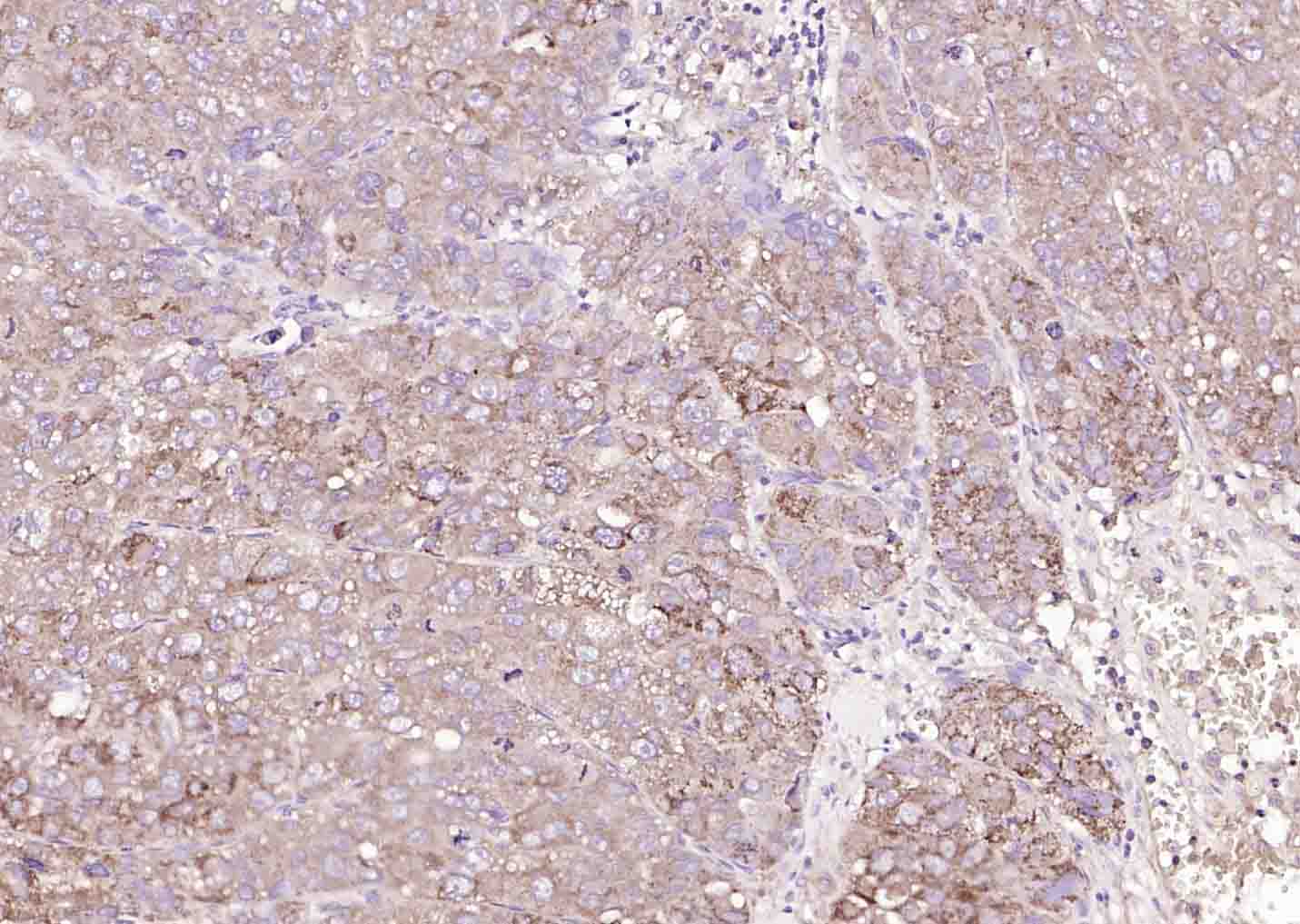 Paraformaldehyde-fixed, paraffin embedded (human liver carcinoma); Antigen retrieval by boiling in sodium citrate buffer (pH6.0) for 15min; Block endogenous peroxidase by 3% hydrogen peroxide for 20 minutes; Blocking buffer (normal goat serum) at 37°C for 30min; Incubation with (Phospho-MKK3(Ser218) + MKK6(Ser207)) Polyclonal Antibody, Unconjugated (bs-3274R) at 1:200 overnight at 4°C, followed by operating according to SP Kit(Rabbit) (sp-0023) instructionsand DAB staining.